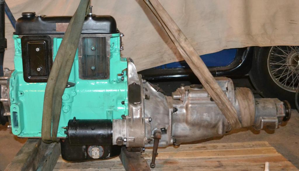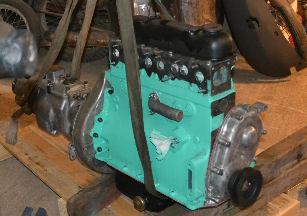 משלבים הילוך, מקרבים את השניים זה לזה, תוקעים את הפיניון לתוך אמצע המצמד, משחקים קצת בציר שבזנב התיבה והופ! – התיבה מחליקה למקומה והשניים מזדווגים. עכשיו יש להדק את זר האומים שסביבם.בתמונה הבאה הם נראים מהצד. שימו לב למדיד גובה השמן באגן, ולסטרטר המורכב כבר גם הוא. נוח יותר להרכיבו בשלב זה, הוא אינו מפריע במאומה להכנסת המנוע או להוצאתו מן השילדה, להפך, והשפעתו על המשקל הכולל – זניחה.וזה מבט נוסף, מהצד השני:שימו לב לפקק הגדול בעל הראש המשושה שבתחתית אגן השמן. זהו פילטר השמן המובנה, הנותן סינון גס בלבד (רשת פליז בצפיפות של כ 0.1 מ"מ). גם את הרשת הזו, כמו את הרשת בצינור היניקה של הדלק החליף והלחים טינו, שגם חידש את ההברגה באגן ובפילטר. נותר רק לחכות ל"אוזניים הגדולות" של עיגון המנוע – שיחזרו מניקוי וגילוון, כדי שניתן יהיה להרכיב אותו באשיה.