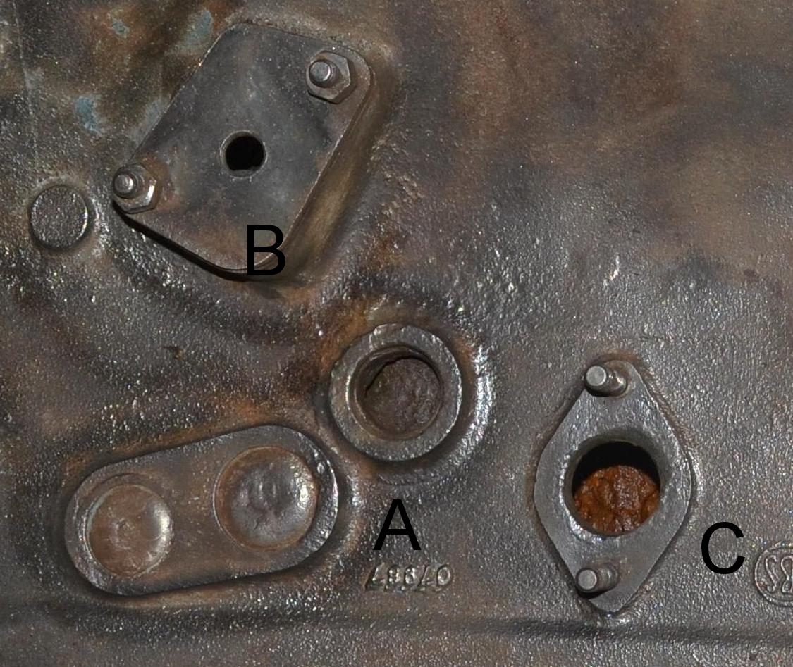 בחינה של הבלוק העלתה כי אחד מהפקקים שלו (A בתמונה שלמטה) חלוד ודולף, ויש להחליפו.את הפקק שולפים ממקומו באופן הבא: קודחים בו (בזהירות!) חור בקוטר כחמישה מ"מ ואליו מכניסים מברג או חפץ דומה ומשתמשים בו כמנוף לשליפה. גם את הפקקים הדרושים צברתי במשך השנים בכלל ובביולי בפרט.אחרי שניקינו היטב את הלוע המיועד מרחנו את שולי הפקק החדש בRTV אדום והכנסנו אותו למקום. הפקק קמור ומתנהג כממברנה. מכה הגונה עליו בפטיש מקבעת אותו היטב למקומו.