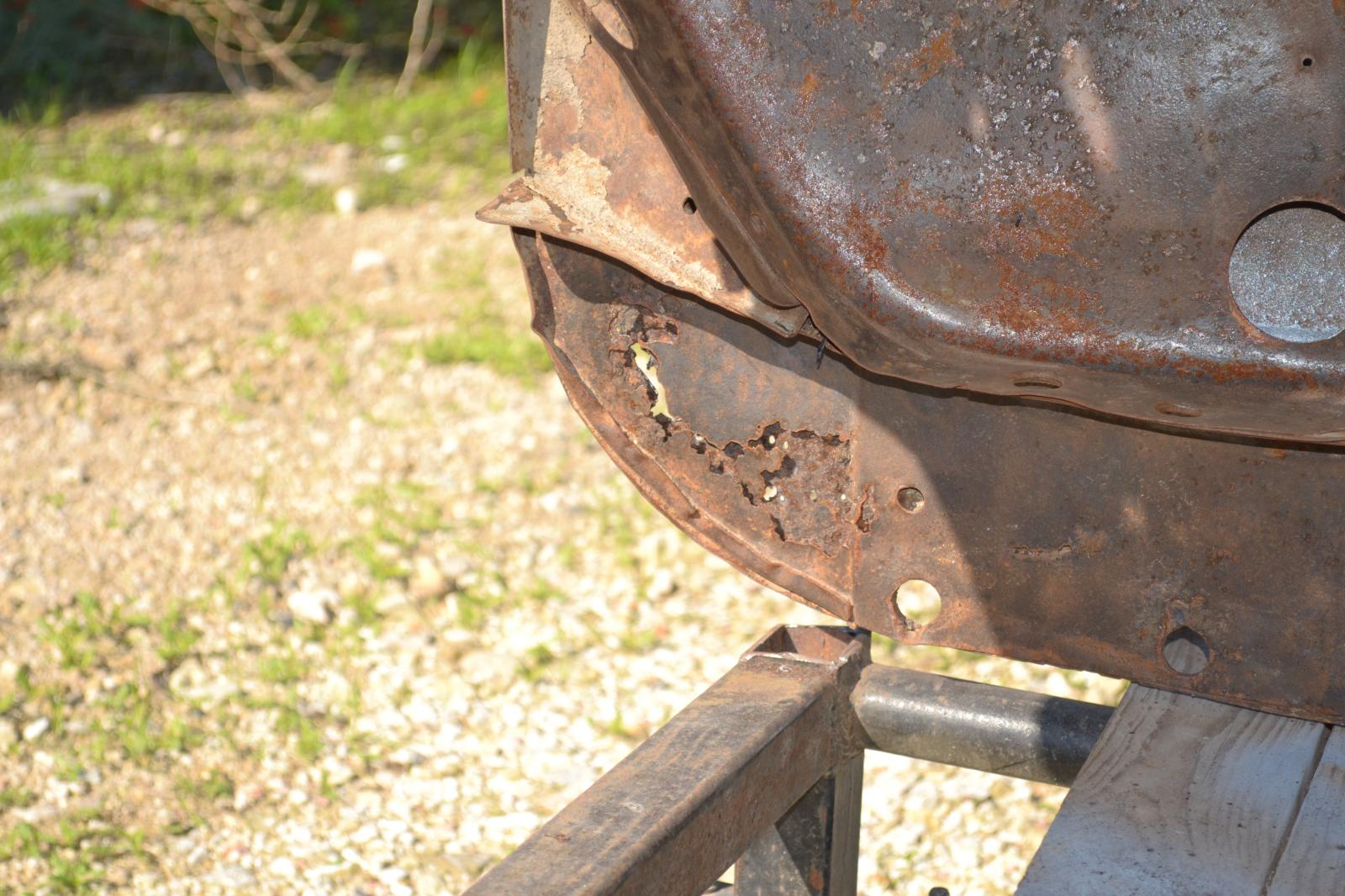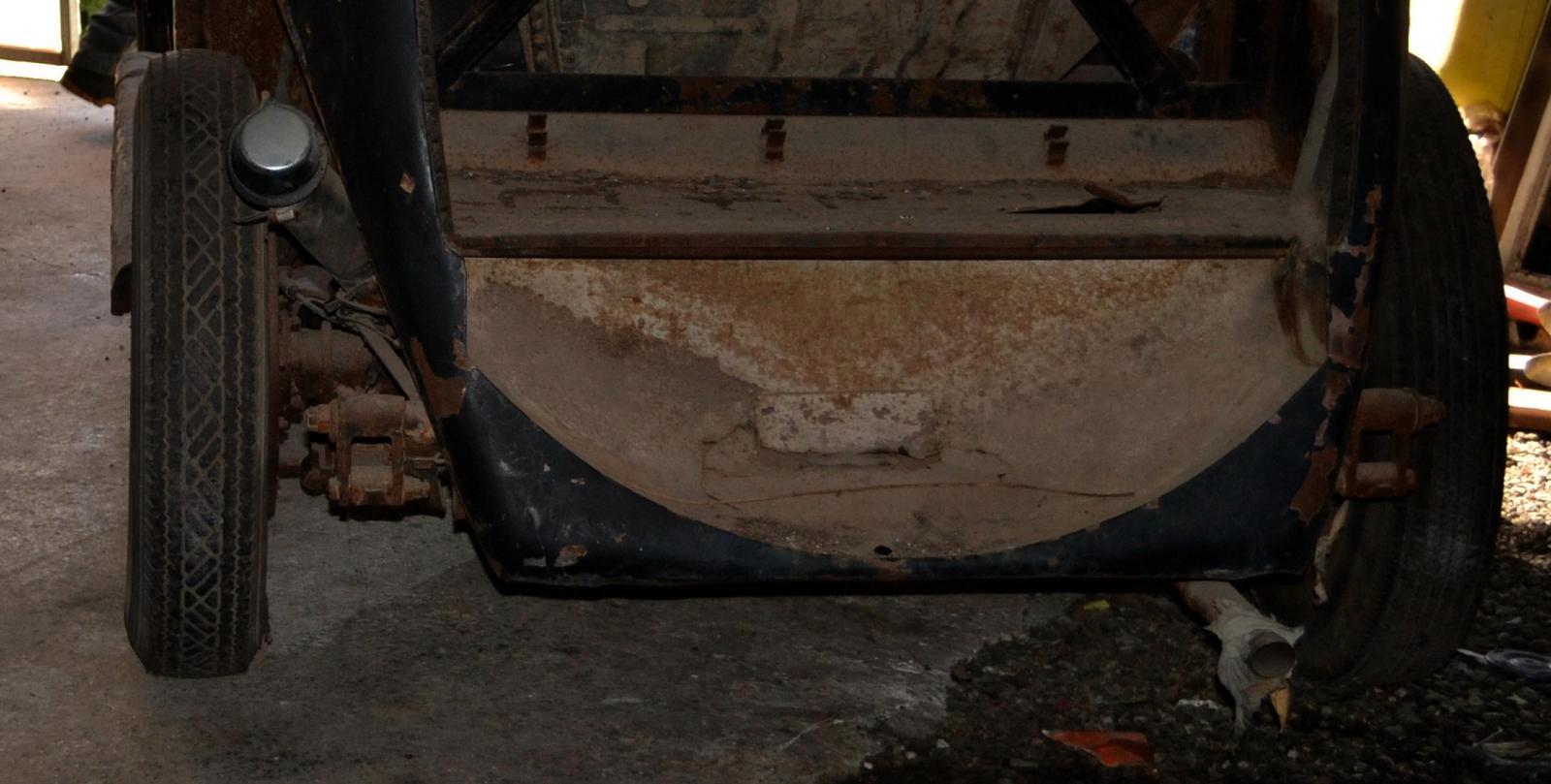 עם תחילת העבודה על המרכב, שהיה כזכור מכוסה בשכבה עבה של לכלוך, חלודה ושאריות של צבע ישן התלבטנו איך להסיר אותם. חששנו כי ניקוי חול יהיה אגרסיבי מדי, ניקוי סודה לא יעיל מספיק, וקרצוף במברשת ברזל כרוך בעבודה רבה מדי. כך נראה המרכב בעת הסרתו מהאשיה: