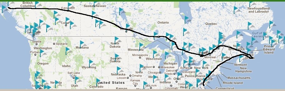 מפרינס רופרט, קולומביה הבריטית, בצפון מערב קנדה, על חוף האוקינוס השקט, ועד ללואיברג, נובה סקוטיה שבמזרח קנדה, על חוף האוקינוס האטלנטי, ומשם דרומה לניו-יורק, ניו-יורק, ארה"ב. סך הכל כ 6000 ק"מ בקרייזלר מודל 72 הגורר כחצי טון אחריו.