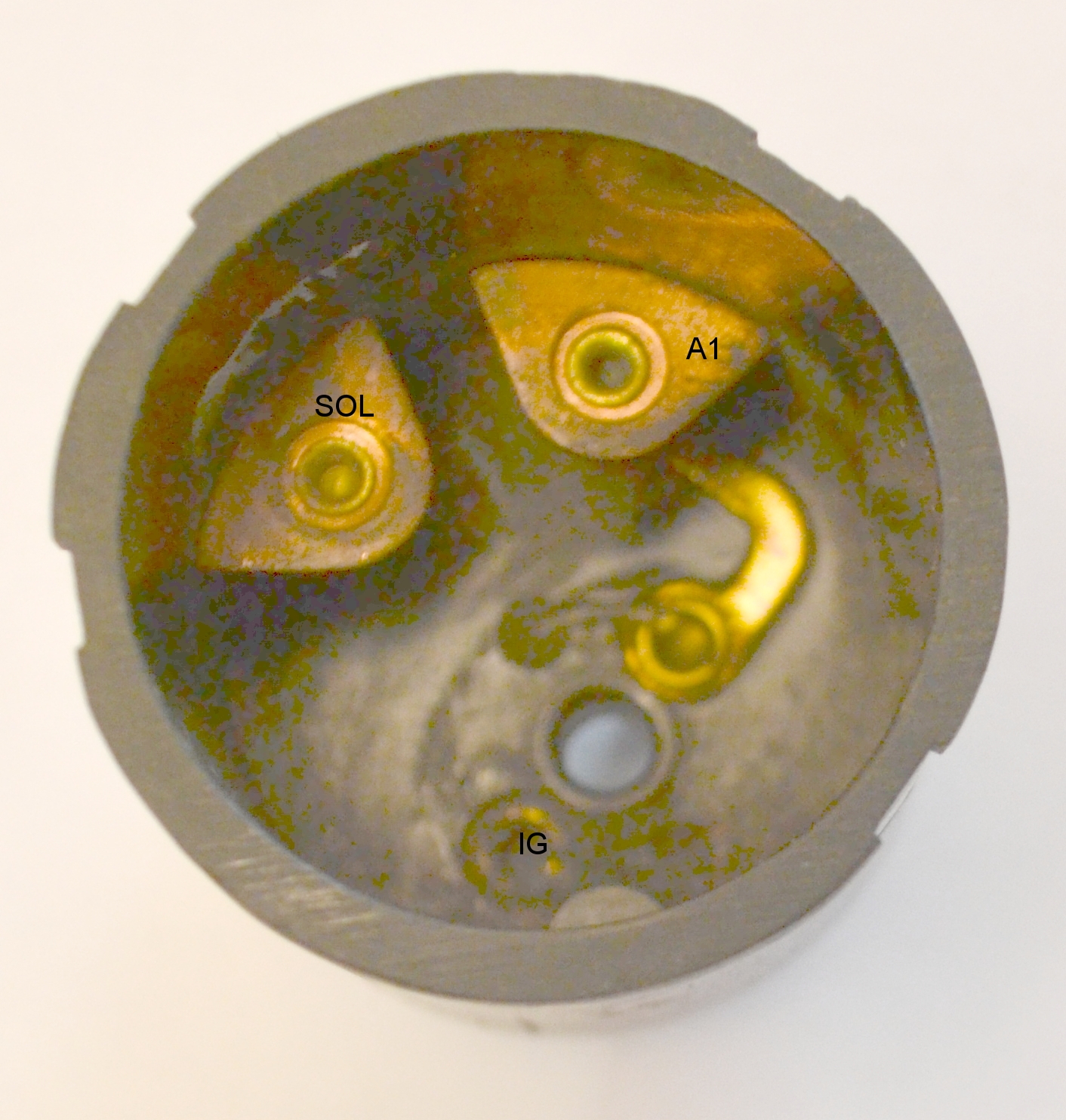 פנים מתג ההצתה (החלקים הסטטיים). נראים בבירור החיבורים על ידי מסמרות נחושת.