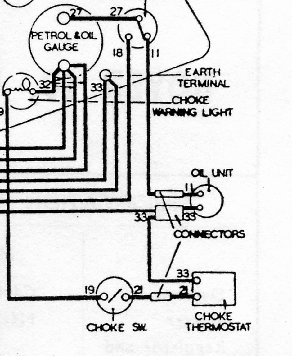 אנחנו רואים כי המעגל מורכב ממתג, טרמוסטט, ונורת בקרה. המתג מחובר אל תושבת ידית הכבל באמצעות קפיץ הנלחץ אליו וסוגר את מגעיו עם משיכת הכבל. הטרמוסטט חש את טמפרטורת המנוע, וכשהיא "נכונה" הוא פותח את המגעים, המנורה כבה, והנהג יודע כי הגיע הזמן להחזיר את הידית למצבה ההתחלתי!