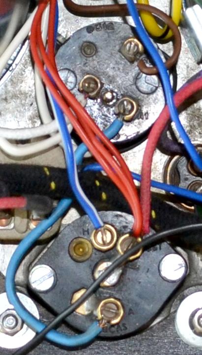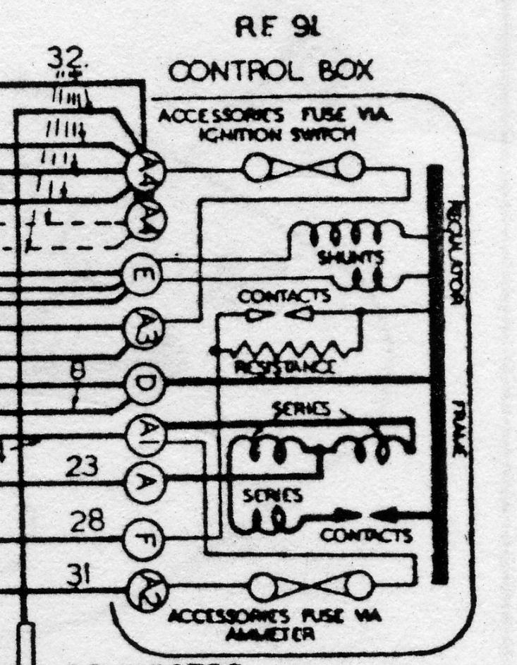 המוליך 23 מתחבר להדק A שעל הוסת (דהיינו 23 מחבר את A עם A .A = אמפר–מטר). A מחוברת לאמצע סליל הקיזוז בווסת הזה. (מטרת סליל הקיזוז היא לגרום לדינמו לייצר יותר זרם בתנאים מסוימים וביניהם הדלקת האורות הגבוהים. לווסת שני אלקטרו–מגנטים: הראשון אחראי על ניתוק המצבר מהדינמו (cut out) כשתפוקתו של הנ"ל יורדת מתחת ל 12V , והשני אחראי על הגבלת הזרם מן הדינמו, כך שלא יעלה על 18A – הערך המירבי המותר (סה"כ ההספק החשמלי המיוצר כ-210 וואט). על כל אחד משני האלקטרו מגנטים מלופפים, זה על גבי זה, שני סוגי סלילים: סליל מקבילי (shunt) העשוי ממוליך בעל חתך גדול ומכיל ליפופים בודדים בלבד וסליל טורי (series) העשוי מחוט עגול ודק ומכיל ליפופים רבים. התכונות המגנטיות נקבעות לפי מכפלת מספר הליפופים באמפרים הזורמים דרכם. נקודת החיבור A שעל הווסת נמצאת באמצעו של הליפוף המקבילי, על האלקטרו–מגנט האחראי על ויסות המתח (הסליל המקבילי השני שבשרטוט נמצא על ה cut-out). צד אחד של ליפוף זה מתחבר ל A1 וממנו למוליך 24 (שחור–לבן) החוזר כל הדרך אל מתג האורות הראשי לנקודה A שעליו, ומשם ישירות למפסק הראשי (המפתח), לנקודה המסומנת בסכמה ב B.